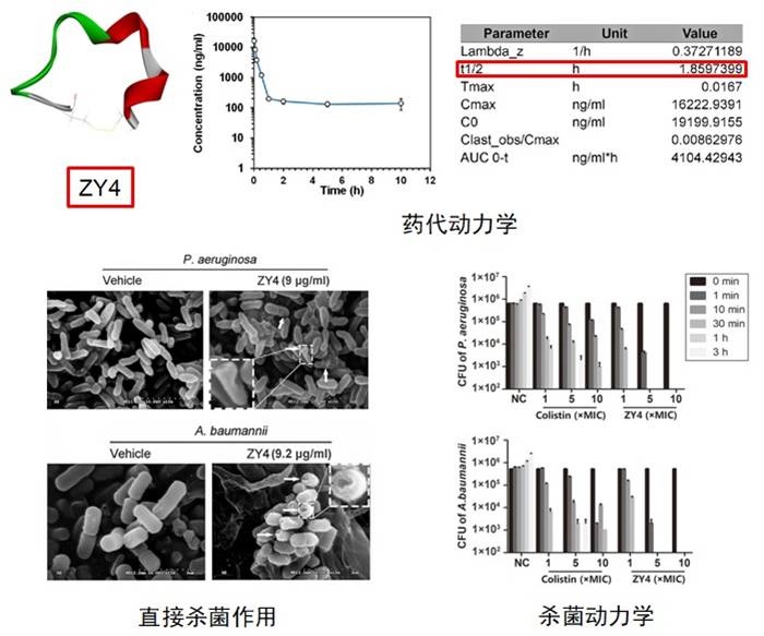 抗菌肽是一类具有抗菌活性的多肽类小分子,因其杀菌快速且很难导致微生物耐药受到全世界的关注,可用于新型抗菌候选药物分子的研发。中国科学院昆明动物研究所研究员赖仞带领的团队,识别了超过1000个抗菌肽,并在此基础上进行抗菌肽的结构功能改造,以提高抗菌活性、降低毒性和成本。ZY4是该团队最近设计改造的抗菌肽,具有强抗菌活性、高稳定性和低毒性。ZY4对耐药鲍曼不动杆菌和绿脓杆菌显示高效快速的杀菌活性,同时ZY4对这两种细菌的生物膜及滞留菌(Persister cells)也有显著的清除作用,其综合抗菌效果明显优于妥布霉素、左氧氟沙星、卡那霉素及头孢替坦等传统抗生素。ZY4长期使用不易产生耐药性,亚抑菌浓度的ZY4与鲍曼不动杆菌和绿脓杆菌持续作用60代后,ZY4对这两类菌的抑菌作用未见明显改变。动物实验表明,ZY4可以显著抑制鲍曼不动杆菌和绿脓杆菌在体内的扩散及绿脓杆菌引起的肺部感染和炎症。该研究为应对当前越来越严重的耐药性鲍曼不动杆菌和绿脓杆菌的传播及感染问题提供了良好的候选药物分子,也为设计高效低毒的抗菌肽提供了参考新策略。