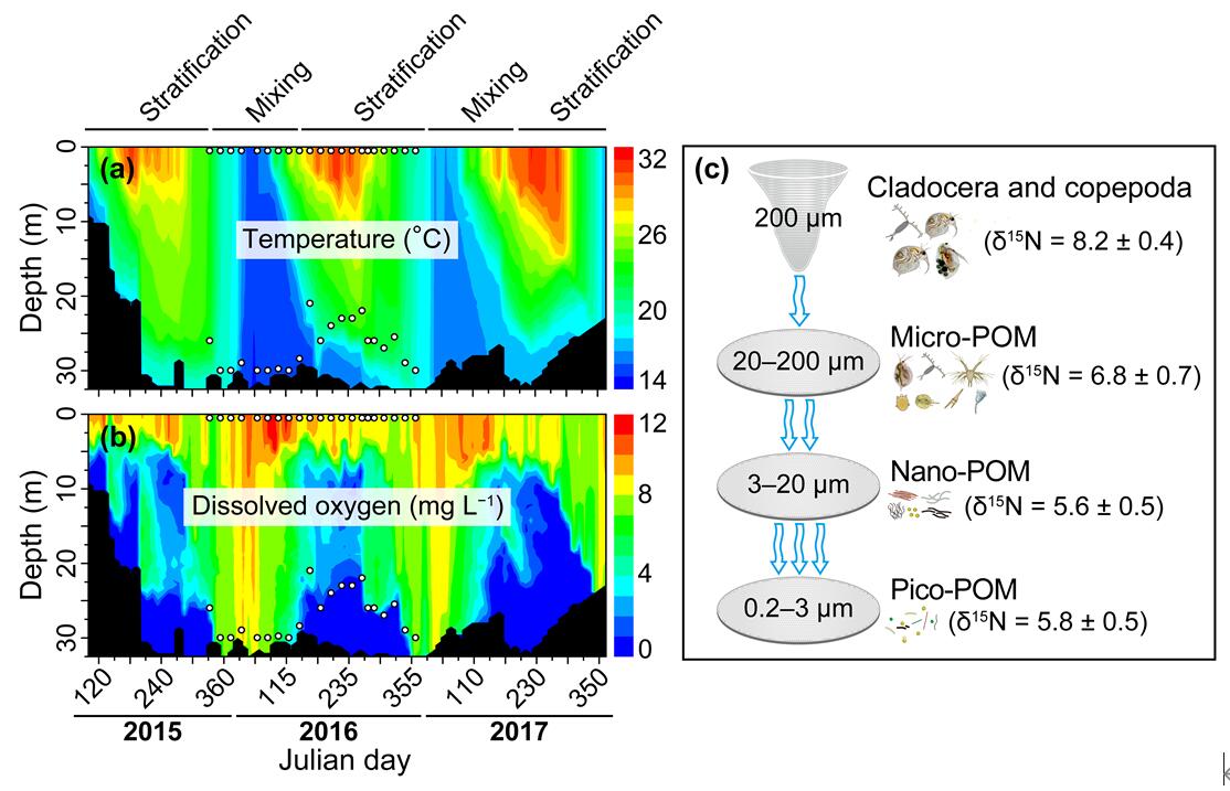水生态健康研究组首先在福建建立了水库长期定位生态系统观测研究站,沿着温度变化梯度选取汀溪水库的时间序列样品,对比研究了浮游动物个体大小和同位素生态位宽度的变化过程,进而揭示水库热分层期(高温期)和混合期(低温期)浮游生物群落与温度变化的关系。结果显示,在温度较低的混合期,浮游动物的个体大小和群落的同位素生态位宽度均大于分层期,这些变化与时间序列上水温的变化密切相关。种群内和种群间的差异对群落的个体大小以及营养级结构变化的贡献随时间发生变化,从混合期到分层期,这些种群内和种群间差异的贡献与水温的变化具有很强的相关性。时间序列分析结果显示,水温对个体大小具有直接的影响,而对浮游动物群落营养级结构的影响主要通过营养级冗余间接的发挥作用。水温与群落的某些特性(如群落中生物个体大小、营养冗余或者相互作用)表现出复杂的相互关系,且共同主导了浮游动物群落营养级结构的变化。该研究解析了温度的升高将会如何改变浮游动物个体大小以及群落营养级结构,提高了人们对浮游微食物网结构变化过程的认知水平,为将来应对气候变化进行适应性管理提供了科学依据。