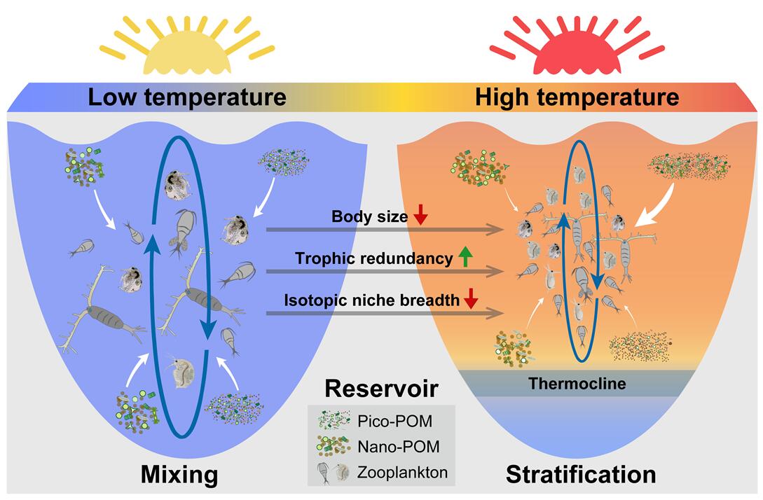 淡水浮游生物包括细菌、藻类、微型动物等,它们既是水生态系统的主要生产者,也是关键消费者和分解者,在物质循环、污染物降解和水体自净等方面发挥极其重要的基础和关键作用。浮游动物作为水体中最主要的初级消费者,发挥着不可替代的生态作用。另一方面,浮游动物通过上行和下行效应,对次级消费者(鱼类)和初级生产者(藻类)群落结构产生显著影响。因此,在全球气温升高的背景下,全面理解和认知浮游动物的个体特征(如个体大小)和群落营养级结构对温度的响应过程和机制显得尤为重要。