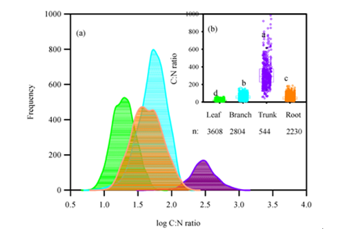 碳(C)和氮(N)是植物生长发育最基础的两个元素,二者相互耦合使得C:N成为探讨植物元素分配与适应策略的重要指标。比如,高C:N植物具有高氮素利用效率;而低C:N凋落物具有分解快的特质。因此,C:N成为许多生态过程模型的一个重要的输入参数。然而,前期研究主要着眼于叶片C:N或单独某一器官,而在区域或全球尺度关于植物叶-枝-干-根C:N变化规律、演化机制及其生态学意义还未见报道,很大程度阻碍了人们关于植物对环境变化的响应与适应机理的认识。