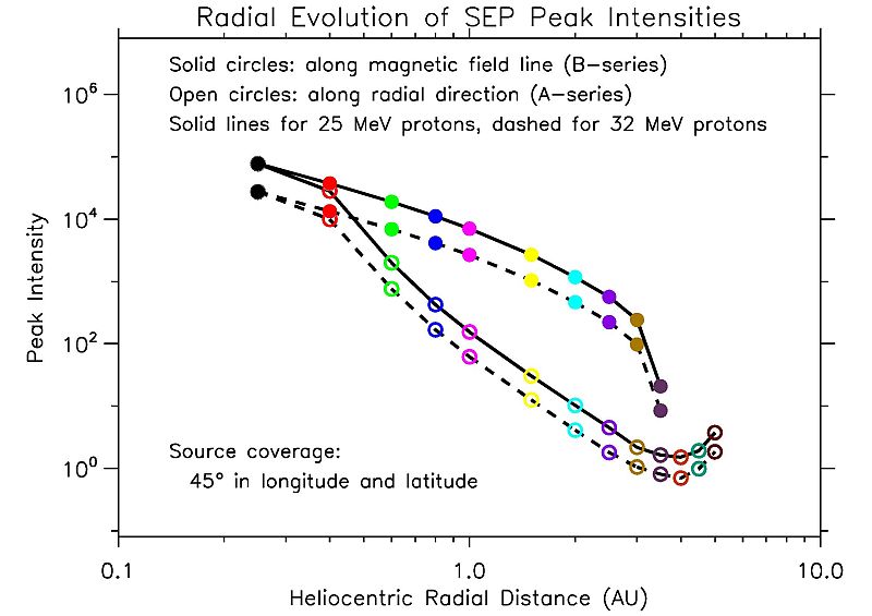 图2 高能粒子事件峰值通量在内、外日球层的径向演化。扩散机制与绝热聚焦机制的相互作用使高能粒子在外日球层的演化呈现奇特性与复杂性