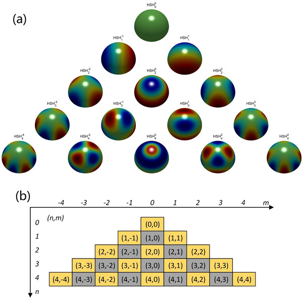 图1(a) 半球谐函数HSH的形态;图1(b) 半球谐函数在球谐函数中的分布,黄色格点为半球谐函数,灰色格点为伴随半球谐函数,两者组合为球谐函数。