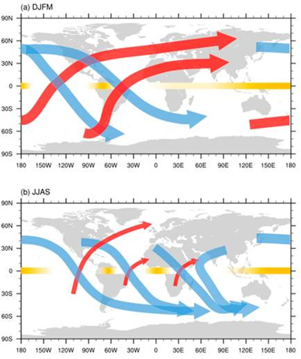 北半球冬季DJFM和夏季JJAS对流层高层定常Rossby波越赤道传播的主要波导示意图。蓝色(红色)箭头表示自北半球向南半球(南半球向北半球)传播的波导,粗的箭头表示通过该窗口的射线数量大,细箭头则表示通过该窗口的射线数量小。沿赤道,黄色深的区域表示障碍区,透明区域表示窗口区。