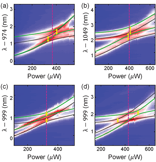 图4.耦合微腔依赖于激发功率的荧光光谱图以及不同Ja,b下的拟合结果。紫色的虚线标记了腔模的共振 ωa=ωb。(a)Ja=0 且 Jb≠0。(b-c)JaJb>0。 (c) Ja=Jb。 (d) JaJb<0 且) Ja=-Jb。DP出现在共振的时候。
