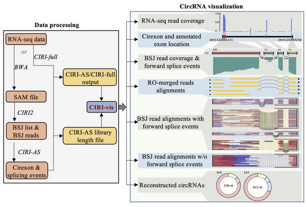 1月18日,中国科学院北京生命科学研究院赵方庆团队于Bioinformatics 杂志上在线刊发了题为Visualization of circular RNAs and their internal splicing events from transcriptomic data 的研究。该研究主要开发了环形RNA的可视化工具——CIRI-vis软件,具有将CIRI-AS或CIRI-Full的输出结果可视化,且可以批量展示环形RNA上的读段信息与内部结构的优势。