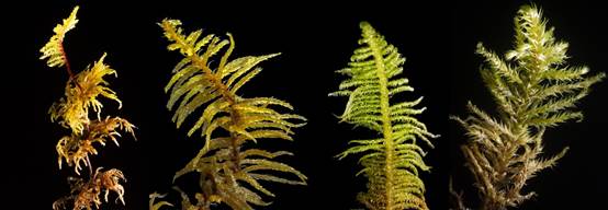 图2:青藏高原东部亚高山森林林下常见藓类植物。左起:塔藓 Hylocomium splendens,锦丝藓 Actinothuidium hookeri,毛疏藓 Ptilium crista-castrensis,和拟垂枝藓 Rhytidiadelphus triquetrus。