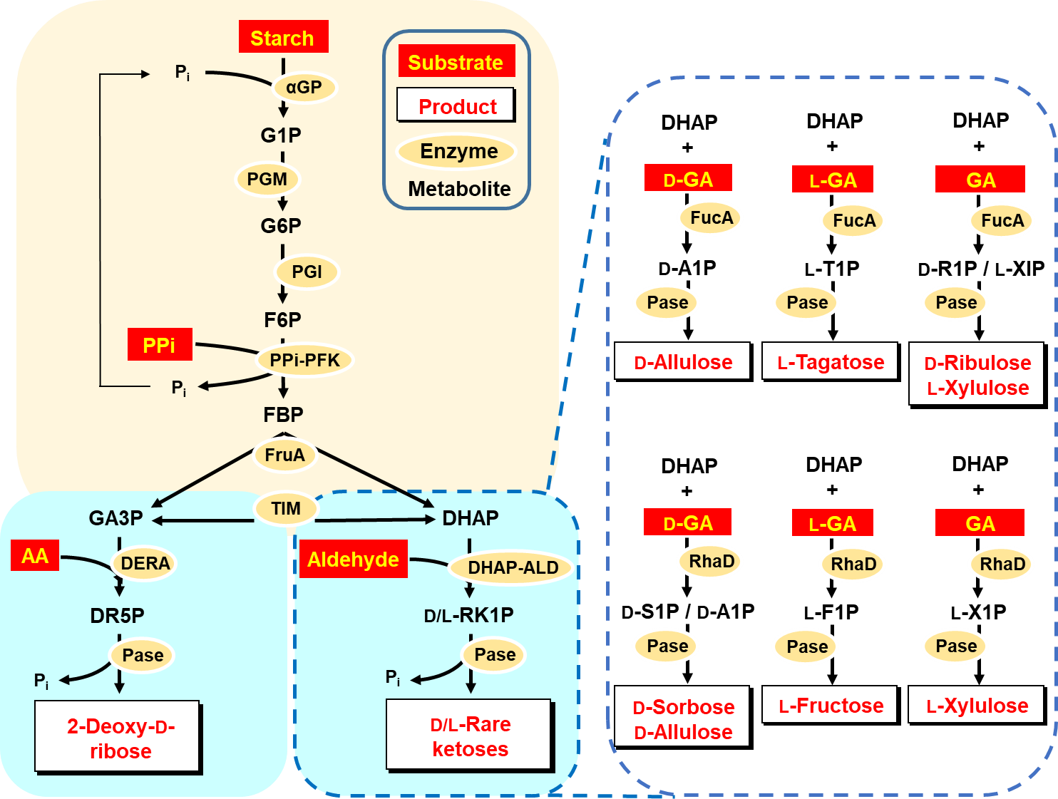 中国科学院天津工业生物技术研究所体外合成生物学中心研究团队、功能糖与天然活性物质研究团队与华东理工大学团队,构建了一条以淀粉和焦磷酸盐为底物、无需ATP参与的GA3P和DHAP的体外多酶催化合成途径;GA3P和DHAP进一步经过醛缩酶以及磷酸酶的级联催化,可实现高附加值产品脱氧核糖(DR)的生产,产品实际得率基本达到理论值,具备工业化的可行性。该体外生物制造平台有望通过不对称C-C键合成的手段,为生产高附加值精细化学品提供一种高效、绿色的新方法。