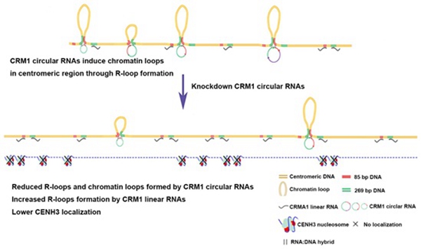 中国科学院遗传与发育生物学研究所韩方普研究组利用玉米为材料,利用着丝粒特异表观标记CENH3-RIP技术建立玉米着丝粒RNA文库并通过高通量测序以及克隆筛选等方法,意外发现来自玉米着丝粒特异反转座子序列CRM1通过反式剪切(Back splicing)的方式产生环RNA(图1)。研究人员进一步通过分子生物学(Divergent primers PCR、Northern等)、基因组学和生物影像观察(原子力显微镜)等方法证实重复序列来源的环状RNA位于着丝粒区域。功能研究发现CRM1来源的环RNA通过R-loop结构结合在着丝粒区域,并影响着丝粒区域高级染色质结构,遗传学的结果显示环RNA水平的降低能够影响CENH3核小体的定位。这些结果说明重复序列在着丝粒空间构象的维持和功能的发挥中发挥重要作用(图2)。