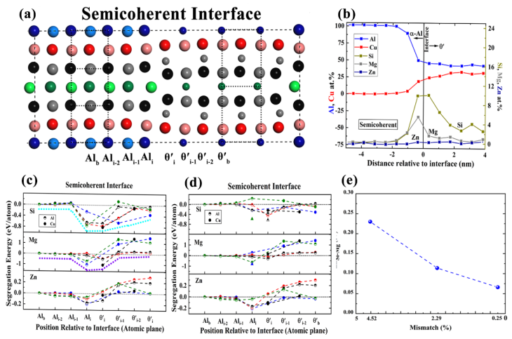 图2. (a) (010)Al||(010)Al2Cu半共格界面计算模型图中大球和小球分别代表Al原子和Cu原子,不同颜色的原子代表(c)和(d)中不同的偏析路径;(b) 实验观察的半共格界面附近Al、Cu、Si、Mg、Zn的浓度,数据来源于文章:DOI: 10.1103/PhysRevLett.105.076102;(c) LCAO+NCPP方法计算的半共格界面处溶质的偏析能,虚线代表偏析能的变化趋势;(d) DFT-PAW方法计算的半共格界面处溶质的偏析能;(e) 溶质Si和Mg偏析能之间的差值随半共格界面失配度的变化。