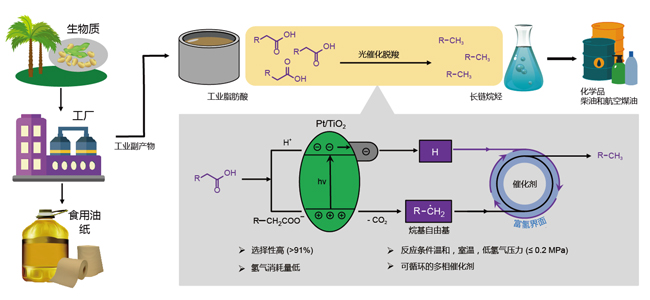 近日,中国科学院大连化学物理研究所生物能源化学品研究组(DNL603)研究员王峰团队利用光催化脱羧策略,通过调控自由基中间物在催化剂表面的转化,实现了温和条件下长链脂肪酸到烷烃的高效转化,为生物质高效转化为绿色燃料提供了新思路。