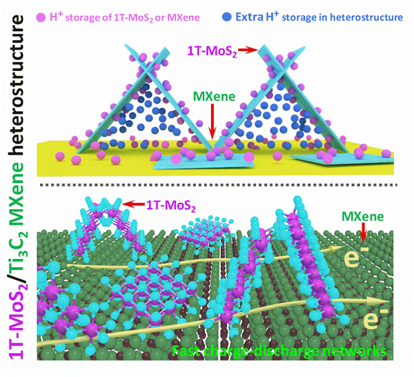 图2. MoS2/Ti3C2 MXene异质结构的电荷存储(上图)及快速充放电(下图)示意图