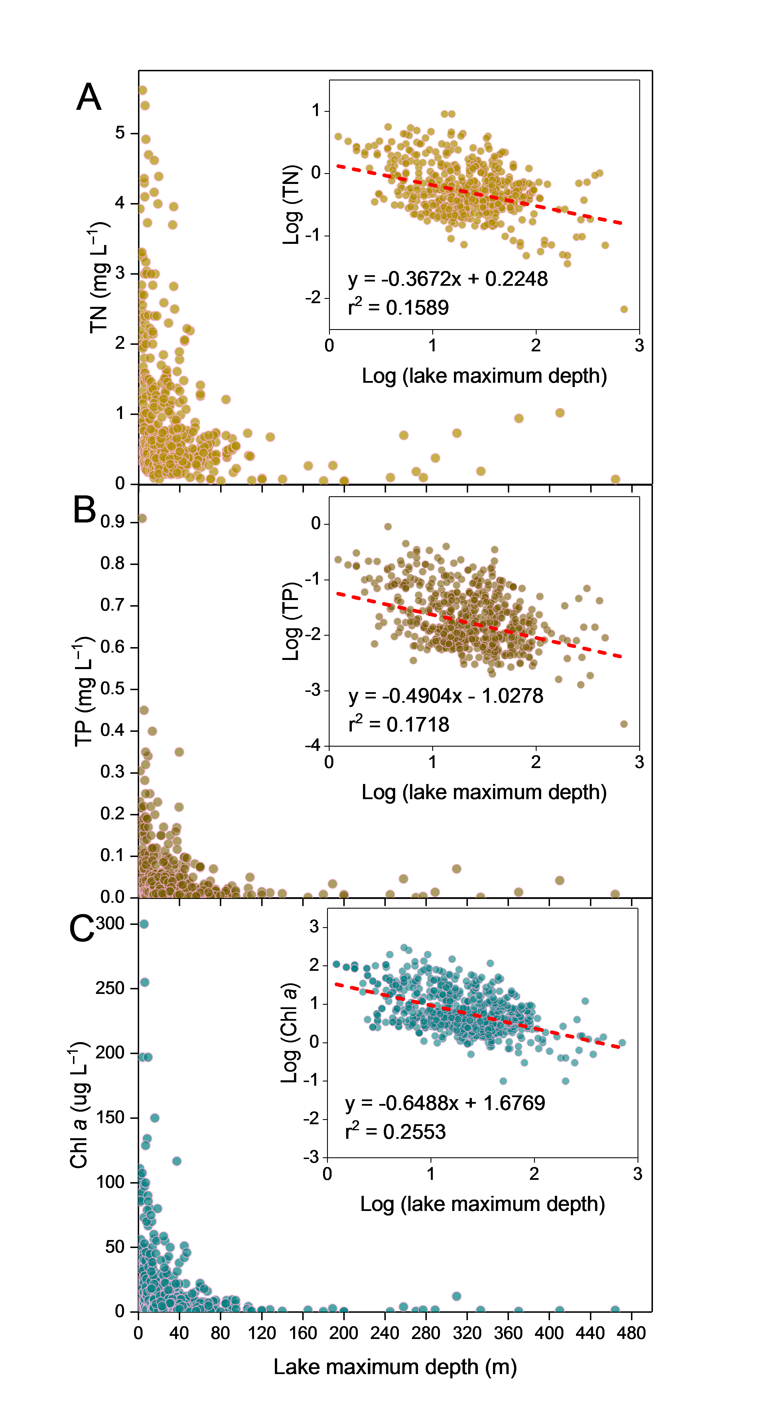 总氮(TN,A)、总磷(TP,B)和叶绿素(Chl a,C)随湖泊最大水深的分布。TN、TP和Chl a的浓度均随湖泊最大深度的增加而降低(p < 0.01),表明富营养化和藻类水华主要发生在浅水湖泊