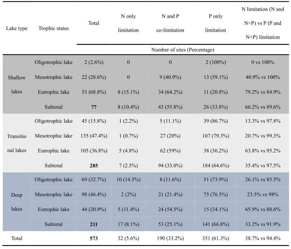该研究从已发表的论文和湖泊数据库中,收集整理了全球573个湖泊的形态与营养状况数据。通过比较湖泊混合层深度(epilimnion)与平均和最大水深,将湖泊分为浅水湖泊(混合深度>最大深度)、深水湖泊(混合深度<平均深度)和过渡型湖泊(平均深度≤混合深度≤最大深度)。此外,以TN:TP比值(质量比)作为湖泊氮磷限制指标,当N:P < 9时为氮限制,当9≤N:P < 22.6时为氮磷双限制,当N:P≥22.6时为磷限制。