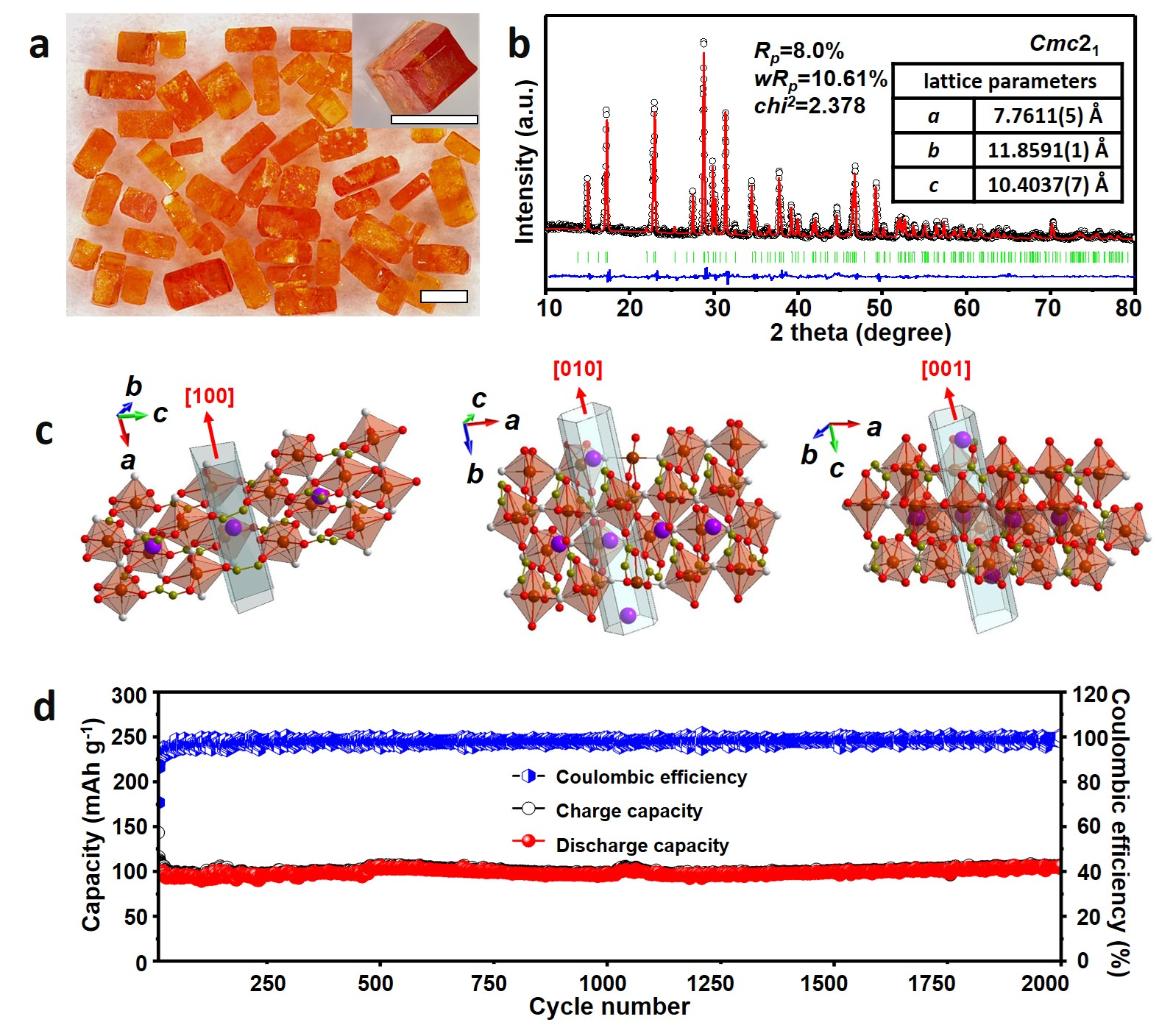 图:新型钾电正极材料的晶体及物相表征(a,b)、晶体结构分析(c)以及长循环性能测试曲线(d)