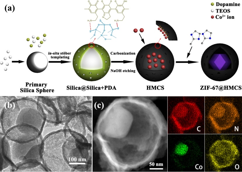 最近,中国科学院福建物质结构研究所结构化学国家重点实验室曹荣和李红芳团队在科技部国家重点研发计划、国家自然科学基金项目、中科院战略性先导专项、中科院前沿科学重点研究计划等资助下成功设计合成了一种空心介孔碳球包覆金属有机框架ZIF-67的蛋黄壳结构复合材料,并将其作为电催化剂应用于电催化氧还原(ORR)、析氧反应(OER)和锌空电池。该设计有效提高ZIF-67材料的导电性能的同时利用空腔限域效应,成功将ZIF-67的尺寸由1微米缩小到100纳米,使其表面裸露更多Co-Nx 配位不饱和位点。该复合材料具有优异的电催化活性及电池性能,复合材料中ZIF-67中的Co-Nx 配位不饱和位点是主要的催化活性中心,而空心介孔碳球和ZIF-67之间的协同作用,有效提高材料的电催化性能。