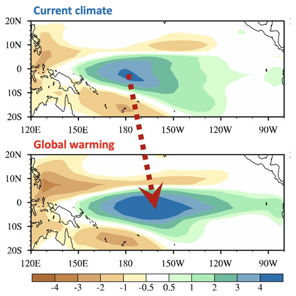 ENSO振荡是气候系统最强的年际变率信号。在El Nino(ENSO正位相)发生时,赤道中东太平洋降水增加。降水释放的潜热导致热带太平洋上空形成深厚的加热异常,驱动全球气候系统发生变化。前期研究基于耦合模式比较计划第五阶段(CMIP5)提供的耦合模式气候预估试验结果指出,人类活动导致的全球变暖将引起ENSO驱动的热带降水异常向东移动,进而引起未来整个气候系统对ENSO响应的剧变。但是,耦合模式的预估结果尚缺少坚实的理论支撑。其中一个关键的难点是耦合模式中未来ENSO强度本身将变强还是变弱存在巨大的不确定性。