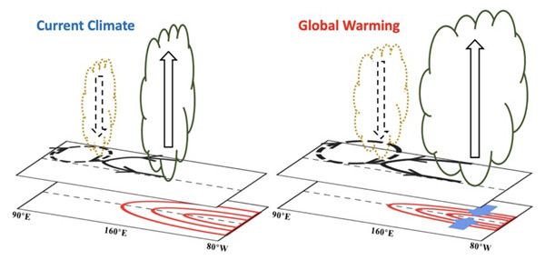 中国科学院大气物理研究所副研究员吴波指导南京信息工程大学客座博士生颜子翔,与夏威夷大学教授Tim Li、英国Exeter大学教授Mat Collins、英国气象局Hadley中心博士Robin Clark和James Murphy、大气所研究员周天军和南京信息工程大学教授谭桂容开展合作,在Science Advances 杂志上发表文章,提出了理解全球变暖背景下ENSO驱动降水异常东移的新机制(图1)。该研究分析了英国气象局开展的大集合气候变化模拟试验结果。全球变暖背景下,由于热带太平洋信风减弱,太平洋副热带经向翻转环流(STC)减弱,导致ENSO经向宽度(指SST异常)变窄。即使ENSO强度变化不大,变窄的ENSO将加强赤道中东太平洋水汽辐合异常,令降水异常东移(图2)。