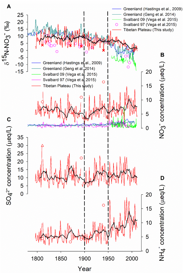 图2. 冰芯硝酸盐含量和δ15N、硫酸盐(SO42-)和铵盐(NH4+)离子含量的历史变化