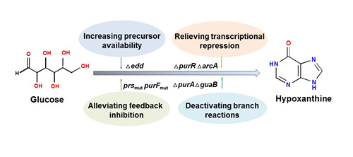 在绝大多数微生物中,嘌呤的合成途径主要有从头合成途径和补救途径。嘌呤的从头合成途径是以5-磷酸核糖焦磷酸(PRPP)和谷氨酰胺为前体,经过10步反应合成次黄嘌呤核苷酸(IMP),IMP再通过两条支路分别转化为腺苷单磷酸(AMP)和 鸟苷单磷酸(GMP)。同时,IMP也可以进一步降解为次黄嘌呤。尽管嘌呤化合物的从头合成途径早已探明,但该合成途径受到转录阻遏、转录衰减以及底物反馈抑制等不同层面的严密调控,天然状态下难以积累。中国科学院青岛生物能源与过程研究所生物基材料组群赵广研究组近期在大肠杆菌内成功实现了次黄嘌呤的高效合成,并利用转录组学和荧光定量PCR技术分析了嘌呤代谢途径的合成调控机制。首先通过解除调控蛋白PurR的转录阻遏调控、关键酶定点突变缓解底物反馈抑制、提高嘌呤合成前体的积累,破坏IMP的分支代谢途径等方法将次黄嘌呤的积累提高近10倍。在5L发酵罐水平次黄嘌呤积累达到791.54 mg/L。然而在次黄嘌呤发酵过程中发现,副产物乙酸和黄嘌呤的积累显著。为解决副产物的积累问题,该课题组研究人员发现全局调控因子ArcA在嘌呤代谢调控中具有较好的效果,乙酸副产物的积累从8.40 g/L降低至1.21 g/L,而次黄嘌呤的产量达到1243 mg/L。