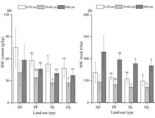 4种土地利用类型中土壤碳含量和储量