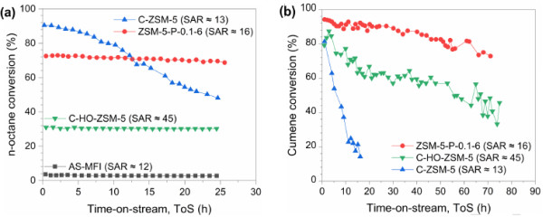 此项研究通过高温快速老化沸石合成母液制备出含有非骨架铝的沸石母相,而后,通过四丙基氢氧化铵溶解、再结晶将非骨架铝转化为骨架铝,同时形成中空结构。该方法的新颖性在于,采用含有非骨架铝的沸石作为母相,打破了四配位骨架铝对沸石溶解、再结晶的限制,从而制备出硅铝比低至16的中空ZSM-5型沸石。低硅铝比中空ZSM-5型沸石在碳氢化合物裂解中,尤其是在大分子碳氢化合物裂解中表现出高活性、高稳定性和高丙烯选择性的显著优势。通过脉冲场梯度核磁共振(PFG-NMR)研究了沸石催化剂的传质特性,表明低硅铝比中空ZSM-5型沸石优异的催化性能来源于大量的可接触酸性位。该方法不仅适用于合成低硅铝比中空ZSM-5型沸石,也为其它中空杂原子掺杂沸石合成提供了可行的技术路线。