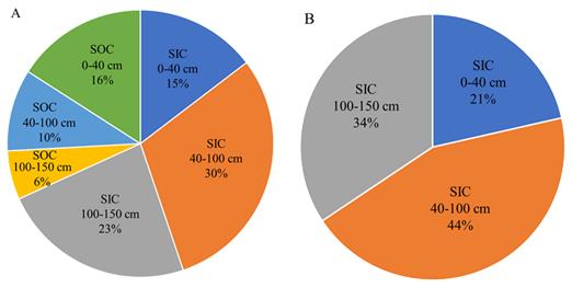 土壤碳不同形态(A)和土壤无机碳(B)在土壤剖面的分布