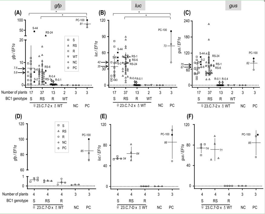 图:沉默转基因(gfp)的表达激活以及它对其它定点整合转基因表达的影响。散点图所显示的为转基因gfp(A、D)、luc(B、E)和gus(C、F)的相对表达量。图中,23.C.7为具有定点整合和随机整合的两个gfp拷贝的植株,与其基因型相同的后代为23.C.7-2和23.C.7-D。在23.C.7-2和23.C.7-D回交的后代(BC1)中均包含S(含有单个定点整合gfp的植株)、RS(含有定点整合和随机整合的gfp的植株)和R(只含有随机整合gfp的植株)三种基因型。阴性对照(NC)为野生型。阳性对照(PC)为只具有一个相同结构的定点整合gfp的23.C.4植株回交的后代,这些后代也只有一个定点整合gfp。