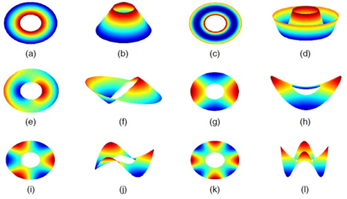 像差是指光学系统中的成像缺陷,物理光学上把像差称之为波前像差或波阵面像差。中国科学院紫金山天文台望远镜实验室博士王海仁及其合作者们提出了表征光学望远镜的像差的新方法——“自由振动模法”。自由振动模法来源于弹性力学薄板理论,在表达上分为圆形和环形自由振动模法(见图1和图2)。以往的光学像差表征法主要使用Zernike多项式表达,它是由诺贝尔物理学奖获得者Zernike, F.在1934年提出的。Zernike多项式一直普遍为人们所使用,但在矫正主动光学动态误差时效率较低。