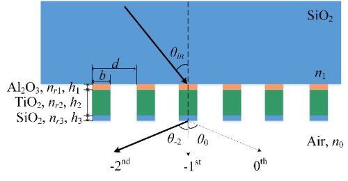 该项研究中,研究人员利用简化模式方法从理论上分析了负二级高效率产生的条件,通过求解色散方程得到各个模式的有效折射率,对各个传播模式进行分析进而得到-2级高效率的条件表达式和光栅结构的初始参数,并通过严格耦合波算法和模拟退火优化算法对其参数进行进一步优化设计,得到了-2级超宽带高效率衍射光栅器件。该结构衍射效率最高可达99.58%,并且实现波长从1.454μm-1.531μm和入射角37.32°-43.3°范围内95%以上高效率输出。研究结果表明,该结构同样具有优良的容差特性,可行性强,适合工业化大批量生产制作。这是首次通过简化模式理论方法分析并设计的多层宽带-2级高效率衍射光栅结构,为简化模式理论方法应用于多层结构光栅设计提供了可能。