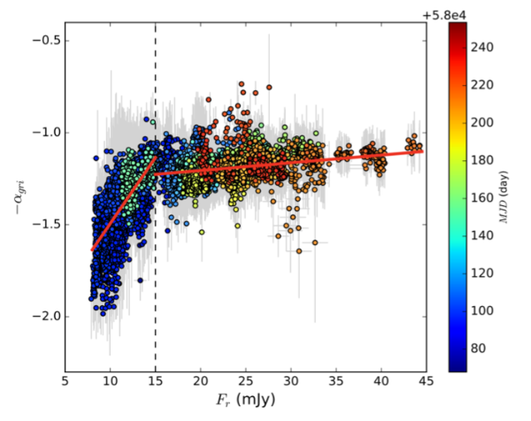 图1 耀变体S5 0716+714长期谱指数随亮度变化的趋势