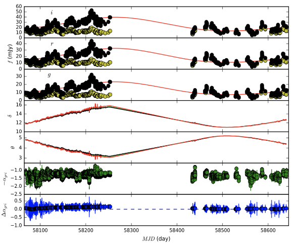 首次在耀变体中发现在低流量态下具有强的变亮变平趋势而更高态下有弱的变亮变平的趋势(长期谱指数随亮度变化的趋势),相对论性喷流中多电子族的加速和冷却机制很好地解释了该结果。提出利用多色光学谱指数不变去追踪喷流几何结构的方法,该方法独立于射电观测,使用该方法分析多色光变曲线和谱指数,发现该耀变体的相对论性喷流(或喷流中的激波)沿着弯曲的路径传播,该结果支持了非均匀的喷流模型(见下图)。