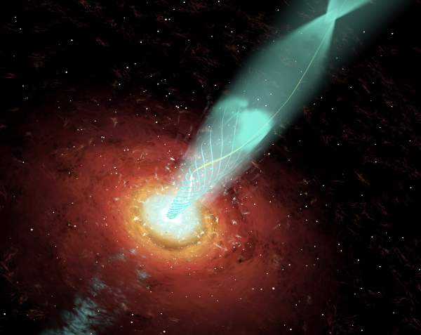 图3 (从黑洞附近出来的)相对论性喷流中激波沿弯曲轨道运动的概念图(图片来自于https://www.bu.edu/blazars/BLLac.html)