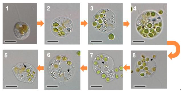 小球藻是一种有重要商业价值的微藻,然而在其规模化培养过程中常发生溃败。通过长期跟踪研究,中国科学院水生生物研究所胡强团队首次发现一种混合营养型鞭毛虫Poterioochromonas malhamensis(马勒姆杯囊棕鞭藻)是小球藻规模化培养中的关键危害物,并从爆发频率、流行季节、危害范围和摄食特征等不同角度解析了该鞭毛虫在小球藻培养中的危害特点,同时探究了不同环境因素(温度、光照强度、pH值、CO2浓度等)对该鞭毛虫生长的影响。结果发现在培养基中通入高浓度CO2维持培养基低pH值,可以有效降低鞭毛虫细胞内pH值,从而实现对鞭毛虫的控制。为了进一步探究鞭毛虫与小球藻的相互作用机理,科研人员以鞭毛虫P.malhamensis和多株微藻为研究对象,分析小球藻的种类、生化组成、细胞大小、细胞壁厚度、生长速度以及与鞭毛虫的细胞数比例等对鞭毛虫摄食和生长的影响因素,结果表明鞭毛虫可以摄食自身体积以下的所有微藻。对于小球藻而言,微藻的细胞壁厚度和生长速率是影响鞭毛虫摄食的主要生物因素。此外,在此基础上,科研人员还分离到一株可以抵抗鞭毛虫捕食的抗性藻株,初步分析该抗性机制与小球藻细胞壁上某些由半乳糖胺组成的细胞壁结构的缺失有关。