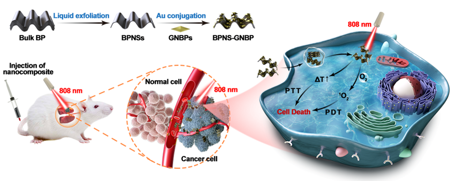 该研究团队同香港中文大学合作,通过在黑磷纳米薄片(BPNSs)上组装金纳米双锥(GNBP)开发了一种新型纳米复合材料(BPNS-GNBP)。这种纳米复合材料可以通过金纳米双锥局部表面等离子体共振,在肿瘤治疗中同时提高黑磷纳米薄片的具有强氧化性的单线态氧的生成和光热转换效率。基于该双模态光治疗功能,BPNS-GNBP在体内外均表现出良好的抑瘤效果。