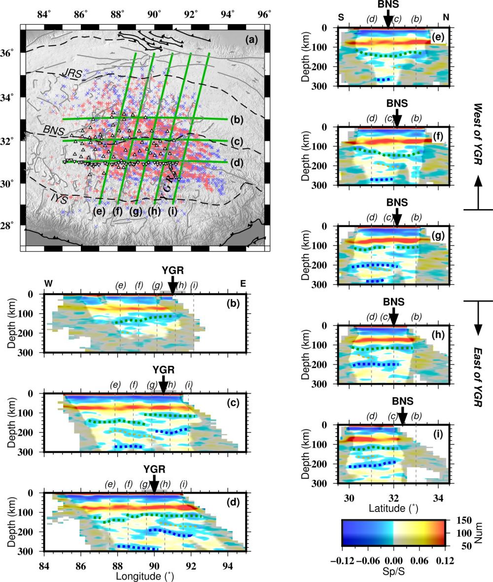 中国科学院地质与地球物理研究所岩石圈演化国家重点实验室壳幔结构探测学科组博士后刘震与合作导师田小波等利用课题组在青藏高原中部布设的两个宽频带流动台阵(图1)记录的天然远震事件的波形记录,提取了S波接收函数,并通过大量接收函数的共转换点叠加成像获得了高原中部岩石圈底界面的起伏形态(图2)。结果显示:在亚东-谷露裂谷下方,印度俯冲板片底界面都发生了明显的东西向错断,两侧板片深度相差70 km;在裂谷的两侧,青藏高原岩石圈底界面在东西向也存在30 km的深度差异。