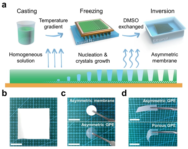 图2.(a)非对称聚合物膜制备示意图。(b-d)非对称聚合物膜GPE实物图。