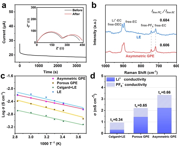 图4. 电解质离子传输性能表征。(a)Asymmetric GPE锂离子迁移数测试,(b)拉曼光谱,(c)离子电导率Arrhenius曲线与(d)离子传输性能。