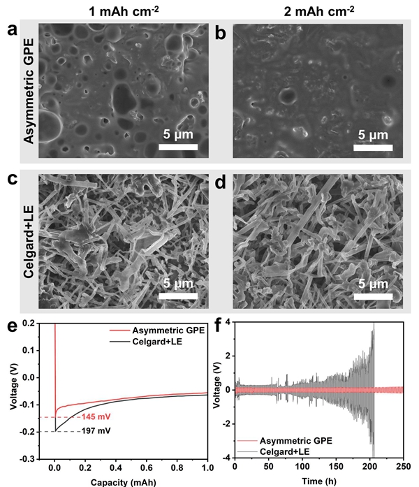 图5. 电解质对金属锂沉积的影响。(a-d)Asymmetric GPE与Celgard+LE在铜箔表面沉积锂形貌SEM图像,(e)金属锂的沉积电位,(f)Li|Li对称电池循环过电位。