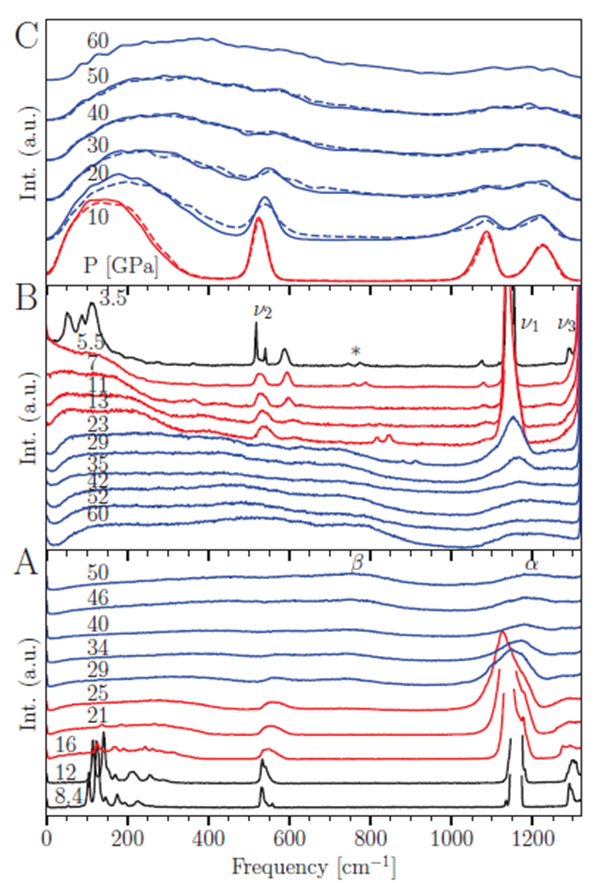 图1. 不同压力下SO2的拉曼光谱:(a) 实验上测量的77 K下的加压过程中的拉曼光谱;(b) 实验上测量的室温下卸压过程中的拉曼光谱;(c) 分子动力学模拟获得的振动态密度谱。黑线-分子晶体相,红线-分子非晶相,蓝线-聚合物非晶相。