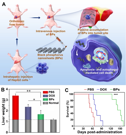 图:黑磷纳米片对原位肝肿瘤的治疗作用。(A)示意图;(B)治疗结束后,不同组别的肝肿瘤重量;(C)生存曲线。