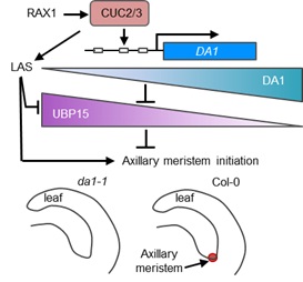 图:CUC2/3-DA1-UBP15途径调控侧枝形成的分子机制