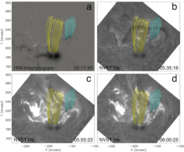 图:NVST观测到暗条爆发过程及其束缚暗条的磁场结构。(黄色和青色线为势场外推的磁场结构)