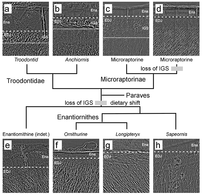 研究团队通过同步辐射的高解析穿透式X-光显微镜,对小型非鸟类恐龙-包含伤齿龙、近鸟龙、小盗龙,以及古鸟类(见图2)-包含今鸟类、反鸟类、会鸟、热河鸟等牙齿的微结构进行对比观察和研究,发现尽管简单的釉质层在早期古鸟类中都有保留,但牙釉质与牙本质之间的多孔罩牙本质层(图3中IGS所示)皆已消失,而多孔罩牙本质(porous mantle dentin)层被认为是肉食性恐龙牙齿中发育的、避免其在掠食过程中牙齿断裂的特殊避震保护结构。不仅在古鸟类中,本次研究的一种小盗龙标本的罩牙本质层也已经消失。这意味着鸟类与部分亲缘关系相近的恐龙,其牙齿不再需要特殊的力学保护结构;间接证实了其在饮食习惯,如咬合力与掠食性方面,与肉食性恐龙产生了极大差异,通过食性转换避开了与肉食性恐龙对食物生态位的竞争,适应能力极大提高,度过最艰难的时刻。相较于古鸟类的普遍性植食或杂食化的演进趋势,虽然非鸟类恐龙的少数类群,如小盗龙,也发生了趋同演化,但仍难以避免灭绝的危机。