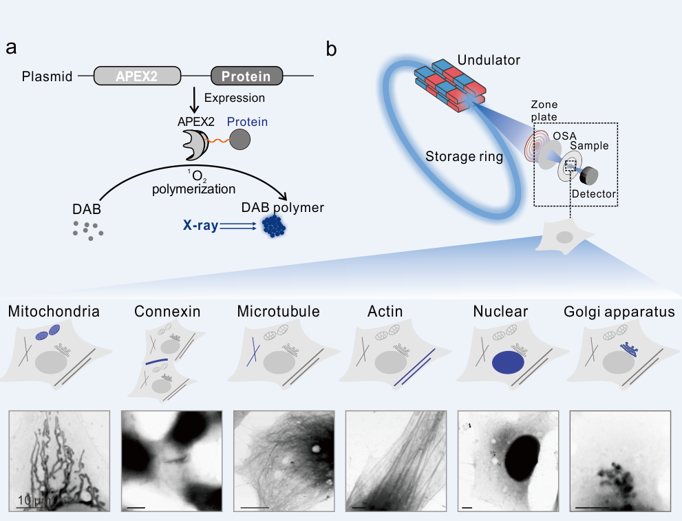 从第一台光学显微镜到荧光显微镜再到最新的超分辨荧光显微镜,显微成像技术的发展始终伴随着生物学研究的发展。与可见光相比,X射线的波长很短,因此,基于同步辐射的X射线显微镜具有内禀的高分辨和强穿透能力,可以对完整细胞进行纳米分辨成像。然而,由于缺乏高特异性生物探针,现有的X射线显微成像多依赖于外源探针,步骤较多且容易带来误差。因此,寻找“X射线显微镜的GFP”成为一个迫切需求(GFP即绿色荧光蛋白,是由钱永健等人发展的荧光成像遗传编码探针)。