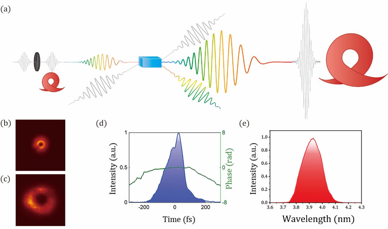 图:(a)基于OPCPA的飞秒中红外涡旋光激光示意图;(b)种子涡旋光光斑;(c)输出涡旋光光斑;(d)输出激光脉冲宽度和相位信息;(e)输出激光光谱信息。
