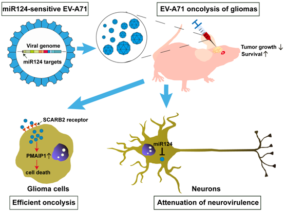 研究人员发现,在体外细胞模型上,EV-A71可有效诱导针对恶性胶质瘤细胞的溶瘤反应。病毒受体SCARB2在胶质瘤细胞和正常胶质细胞的差异表达,以及病毒上调凋亡因子PMAIP1介导的肿瘤细胞死亡,与病毒的溶瘤效应有关。在皮下和大脑原位恶性胶质瘤荷瘤小鼠模型上,EV-A71治疗可抑制肿瘤生长,显著延长小鼠生存期。