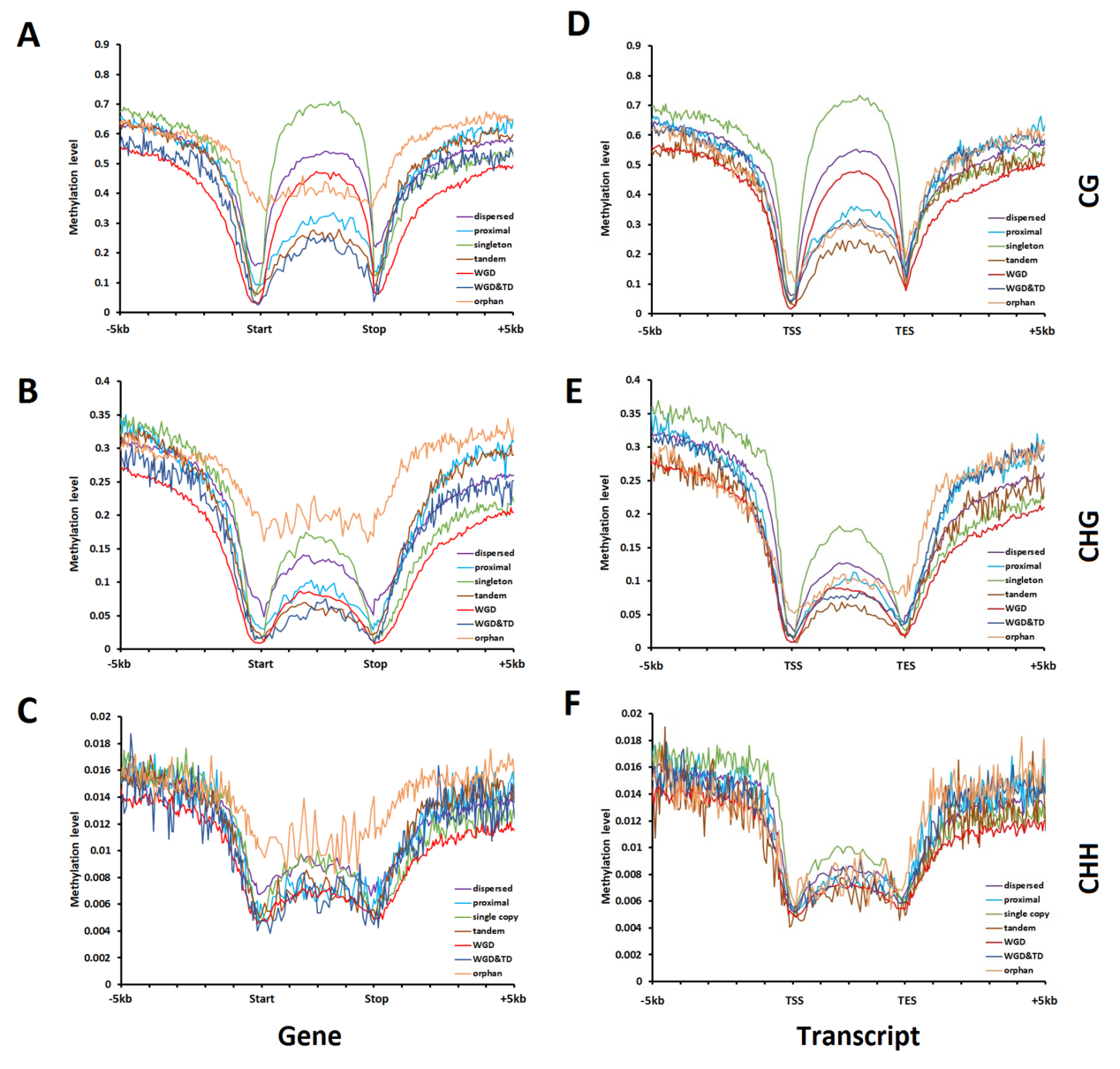 图:莲基因组古多倍化后不同复制状态的基因其CG、CHG和CHH甲基化分布模式比较