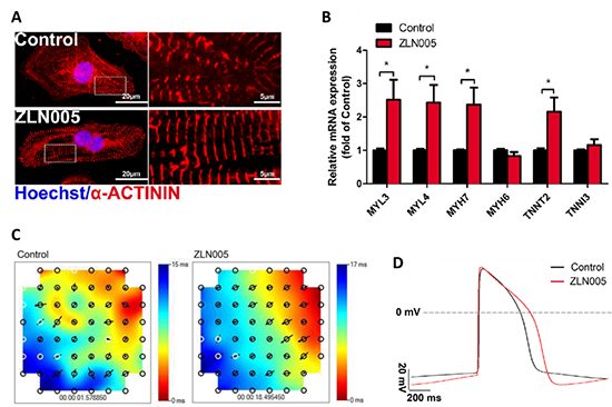 图示:小分子化合物ZLN005可多个方面促进hESC-CMs成熟:(A)心肌细胞肌丝结构;(B)心肌细胞肌丝标志基因的表达;(C)心肌细胞电传导;(D)心肌细胞动作电位。