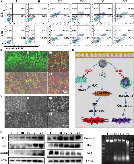 研究人员通过细胞流式、共聚焦、细胞活测定、特异性蛋白表达和DNA ladder等生物学实验和动物模型验证其疗效,并探索这种新型含铁碳酸钙-阿霉素组装体诱导肿瘤细胞死亡的生物学效应及其分子机制。研究发现,ACC@DOX.Fe2+-CaSi-PAMAM-FA/mPEG组装体不仅具有很好的生物安全性和可降解性,疗效也得到了最大程度的提升。阿霉素是最为经典的、广泛应用于肿瘤临床治疗的化疗药物之一,这项研究发现该药物与二价铁离子的配位共传输能够最大程度地增进其疗效,阿霉素不仅能嵌入DNA抑制核酸合成,还能激活肿瘤细胞线粒体的NOX4蛋白产生双氧水,进而与Fe2+发生相互作用而产生脂质过氧化物,诱导BID、AIF和EndoG等蛋白的表达,从而通过铁死亡和损伤DNA 的组合效应而诱导肿瘤细胞死亡,展现出良好的临床应用前景(图2)。