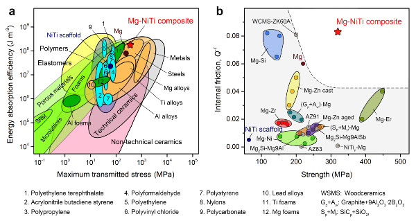 图4:新型镁-镍钛仿生复合材料的强度、阻尼性能和能量吸收效率与其他材料的比较